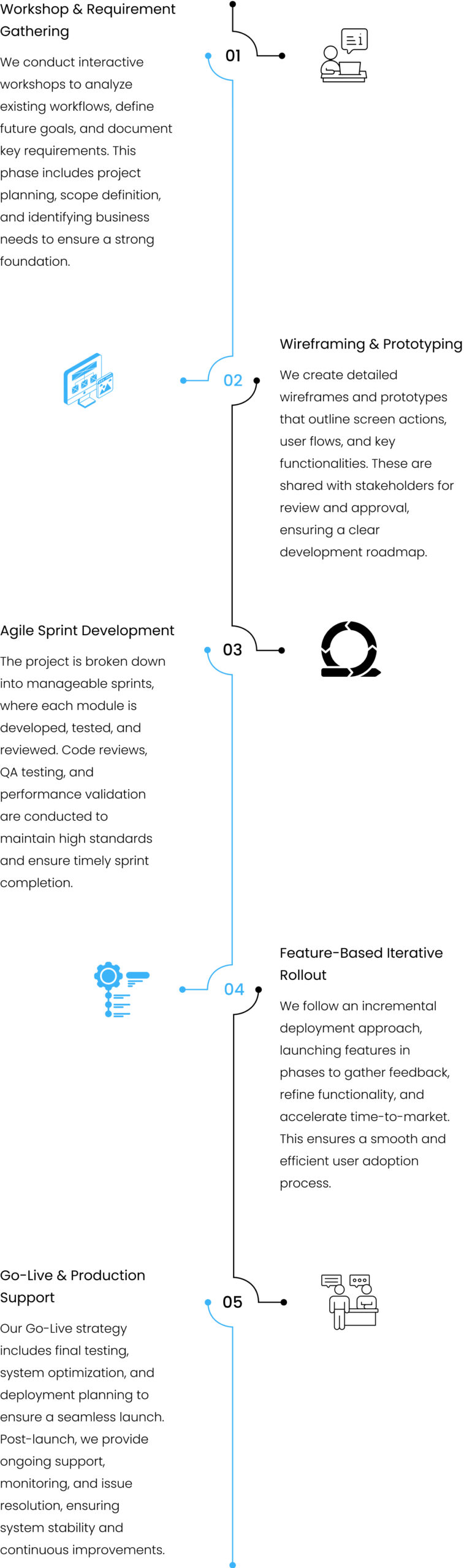 We follow an incremental deployment approach, launching features in phases to gather feedback, refine functionality, and accelerate time-to-market. This ensures a smooth and efficient user adoption process.